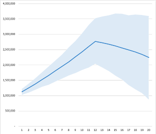 You can create them in Excel without too much difficulty, if you know the trick. The line on this chart is just a normal line chart. The cone area is actually a stacked area – there are two stacked areas, but the first one (the bottom) is invisible.